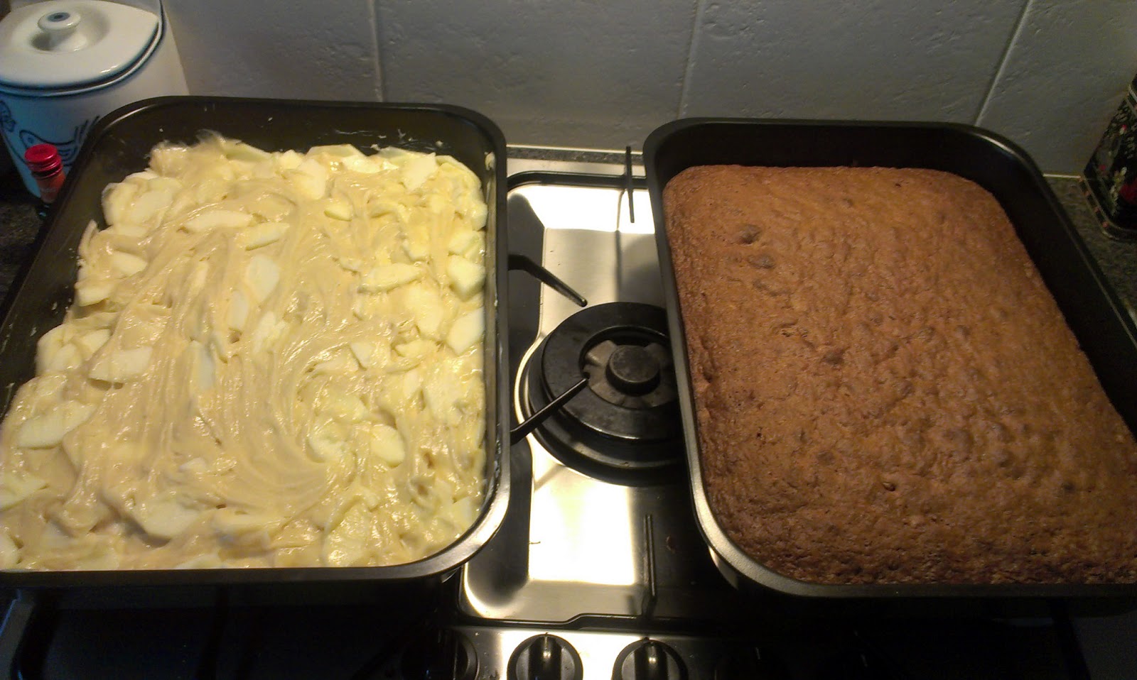 I decided to do tray bakes, as those would be easy to transport + feed lots of people. I decided to do 5 cakes in the end: apple cake, carrot cake, coffee & walnut cake, ginger treacle cake and a chocolate & orange cake. I used big roasting tines for the cakes, worked quite well I might say! Here is the photographic evidence: